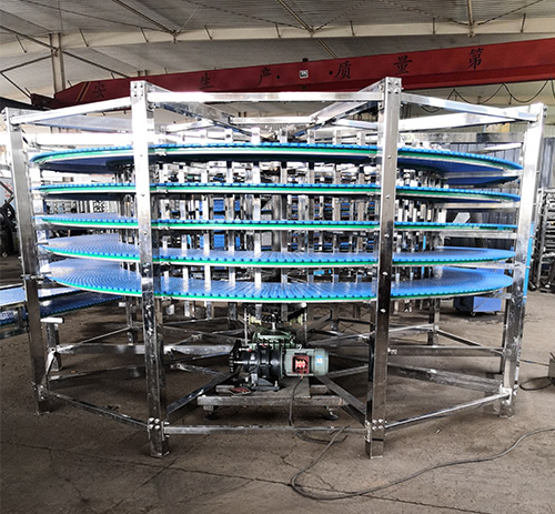 寧津縣鑫昌達機械廠主營食品回盤線,面包螺旋冷卻塔,輸送機設備,面食品、菜卷、春卷、蔬菜、水果、肉食、油炸品、小包裝食品的輸送,分單塔和雙塔多層不銹鋼機身,占地面積小,輸送量大,采用食品級螺旋網帶易清洗和維護。要形成三到6個月之間對螺旋冷卻塔進行定期檢查,若是內部出現問題,應當由專業技術人員對其維修。